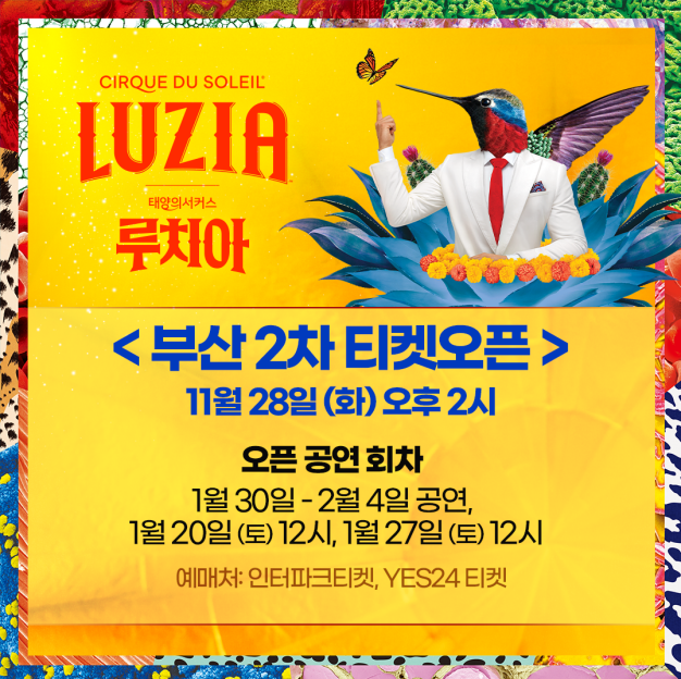 공연정보 - 공연명: 태양의서커스 <루치아> - 부산 ※ 부산 2차 티켓 오픈 일정: 2023. 11. 28(화) 14:00 부산 2차 티켓 오픈 회차: 2024. 01. 30(화) ~ 2024. 02. 04(일) ※ 조기예매 할인: VIP 5%, SR / R / S / A / B 10% *11/28 - 12/17까지 예매 시 적용 *1인 최대 4매