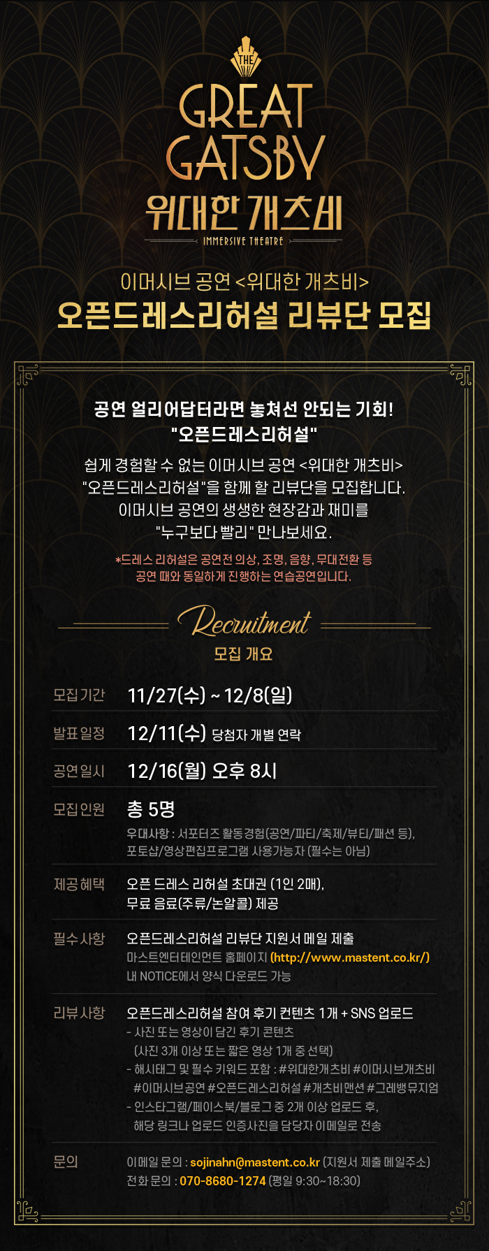 [이벤트] [알림] 이머시브 공연 <위대한 개츠비> 일반인 리뷰단 모집! 관리자 │ 2019-11-27 위대한 개츠비 오픈드레스리허설 일반인 리뷰단 지원서.doc | 위대한 개츠비 오픈드레스리허설 개인정보활용동의서 및 초상권동의서.docx HIT 30532 |