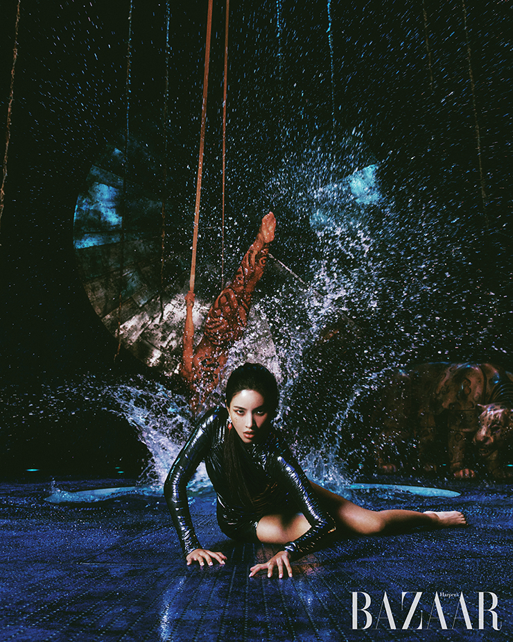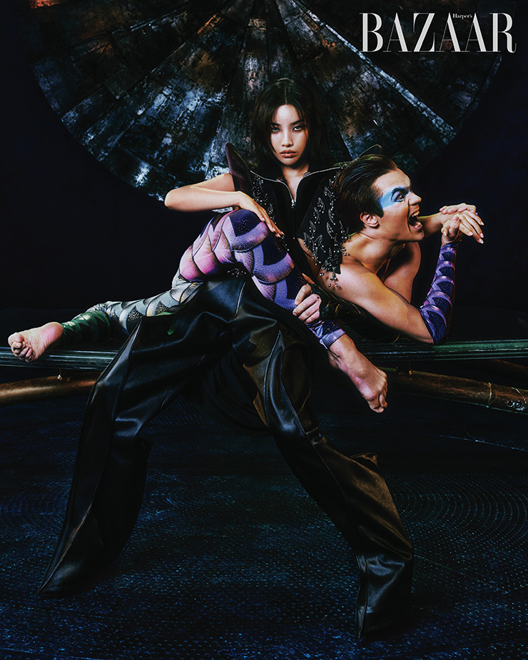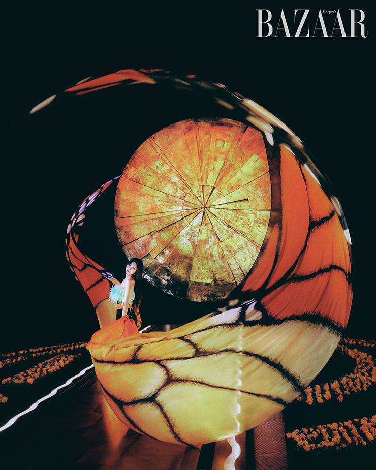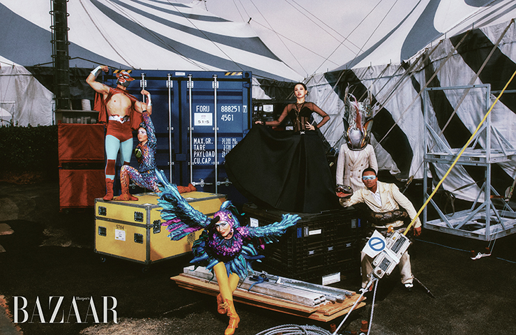 멕시코의 프로 레슬러 ‘루차도르’로 분장한 아티스트와 물고기, 뱀, 벌새 등 동물과 인간의 영혼이 연결된다는 ‘나우알’ 사상에서 영감받은 코스튬을 입은 아티스트들. 드레스는 Versace. 보디 체인은 Swarovski. 이어커프는 Alexander McQueen, Portrait Report. Q. 오늘 화보는 서커스 단원이 되고 싶던 어린 소연을 위해 모인 자리 같았어요. 멕시코를 배경 삼은〈루치아〉무대 세트 곳곳을 누볐죠. A.‘태양의서커스’를 정말 좋아해서 너무 영광이었죠! 공연도, 영화도 여러 번 봤거든요. 현실이 아닌 것 같은 느낌을 받는 게 좋아요. 현실은 우리가 다 아는, 짐작할 수 있는 상황이잖아요. 서커스엔 예측할 수 있는 상황이 하나도 없어요. 사람이 날고, 물구나무를 서도 전혀 힘든 기색도 없는. 그런 상황 자체가 판타지 같아요. Q. 이번 공연을 보면서 가장 인상 깊었던 신을 꼽아본다면요? A. 나비 연기를 하는 여성 아티스트 분이 나오는 장면에서 소름이 돋았어요. 나비 날개가 펼쳐지는 순간, 벨트 위에서 웃으면서 달리는 아티스트를 보는데 뭔가 너무 ‘청춘’ 같은 거예요. 직접 그 의상을 입어보는 게 너무 재미있었고요. Q. 초등학생 시절, 캐나다 ‘태양의서커스’ 본사로 입단 지원서를 보낸 일화가 주목받기도 했어요. 어쩌다 지원서를 보내게 된 거예요? A.〈카레이도 스타〉에 열광하던 시기였는데, 네이버 지식인에 저 같은 아이들이 올린 질문이 꽤 있었어요.(웃음) 몬트리올에 태양의서커스 단원들을 트레이닝하는 학교가 있다는 걸 알게 됐고 국가대표 체조선수들이 입단하는 걸 알게 됐죠. 메일로 지원서를 보내고 한참 뒤에 학비를 알려주는 답장이 오더라고요. Q.〈카레이도 스타〉는 90년대생들에게 향수를 부르는 애니메이션이잖아요. A. 저는 진짜 다음 생에 태어나면 소라로 태어나고 싶어요. 어렸을 때부터 꿈을 키워 서커스 단원으로 입단해 작은 배역부터 시작해 주인공이 되기까지. 주인공 소라의 성장이 너무 큰 감동을 줘요. 처음 방영했을 때부터 수없이 반복해 봤고 지금도 유튜브로 보고, 잘 때도 OST를 듣고 잘 만큼 ‘인생작’이죠.