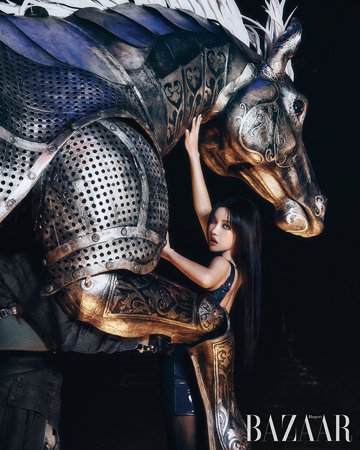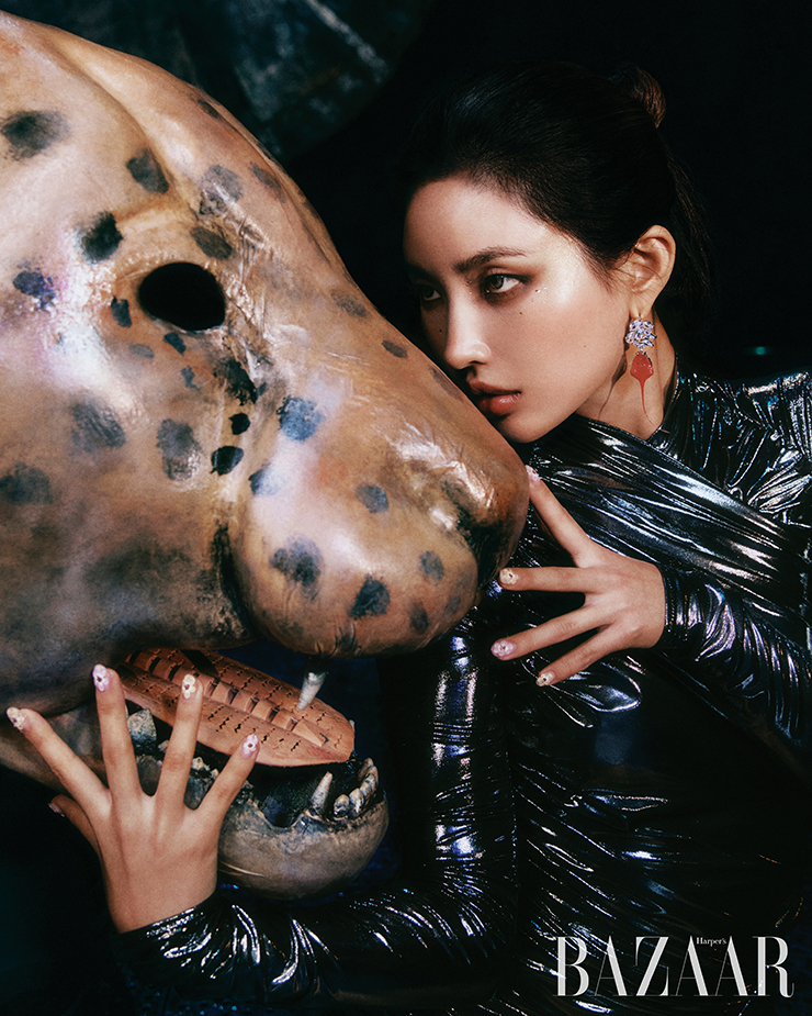 드레스는 Ferragamo. 귀고리는 Ottolinger. Q. 요즘처럼 케이팝이 주목받는 시대에 아이돌로 산다는 건 어떤 기분일지 짐작도 안 가요. 말 그대로 월드스타죠. A. 월드스타라는 말. 엄청난 말이긴 한데, 부정하기도 어려운 게 제가 하는 일이 이제 전 세계적으로 퍼지는 일인 건 사실이잖아요. 저는 음악을 하고, 그 음악을 케이팝을 사랑하는 다른 나라 사람들이 듣고. 이런 시대에 케이팝 아이돌일 수 있다는 사실이 되게 감사해요. 점점 앨범을 내는 속도가, 음악을 소비하는 흐름이 빠르게 변하는 걸 체감하죠. 그 속도에 잘 맞춰서 가고 싶어요. Q. 투어 기간 중 기억에 남을 것 같은 순간을 꼽아본다면요? A. 어느 나라에서든 유독 ‘퀸카’를 떼창해주시는 분들이 많았어요. 한국말이 어려울 텐데 모두가 따라 불러요. 늘 제가 만든 곡이 유치원생이나 초등학생도 따라 부를 수 있는 노래였으면 좋겠다는 생각을 해왔거든요. 아이콘 선배님들의 ‘사랑을 했다’처럼. 요즘 초등학생들이 ‘퀸카’를 많이 부른다는 얘기를 들을 때 되게 뿌듯해요. Q. 쉼 없이 앨범을 만들어왔어요. 최근 발매한 미국 1집 EP 〈HEAT〉는 처음으로 온전히 외부 프로듀서와 협업한 앨범이죠. A. 제가 그리지 않은 (여자)아이들의 모습이 궁금했고, 한번쯤 곡을 받는 경험을 해보고 싶었어요. 믿고 맡겼어요. 전 곡 하나를 만들 때 이런 것도 넣어야지, 저런 것도 넣어야지 계산을 많이 하면서 머리로 곡을 만드는 편이거든요. 그래서 저희 곡이 마니악적이라 생각했는데, 이번 앨범의 곡들은 되게 편안해요. 감성과 감정, 느낌에 따라 부르니 더 많은 사람들에게 다가가기 좋은 곡들이에요.